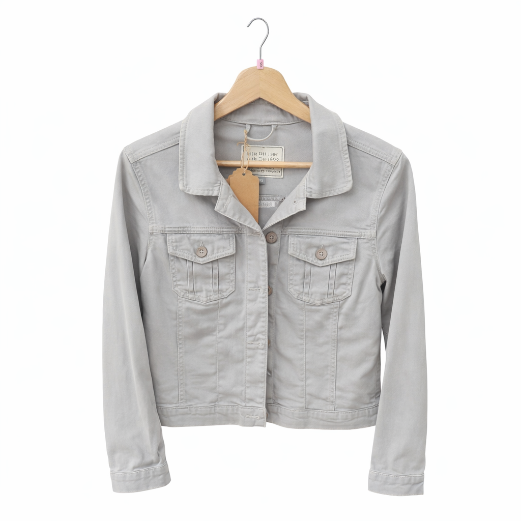 Veste en jean grise, avec décors en tissu.